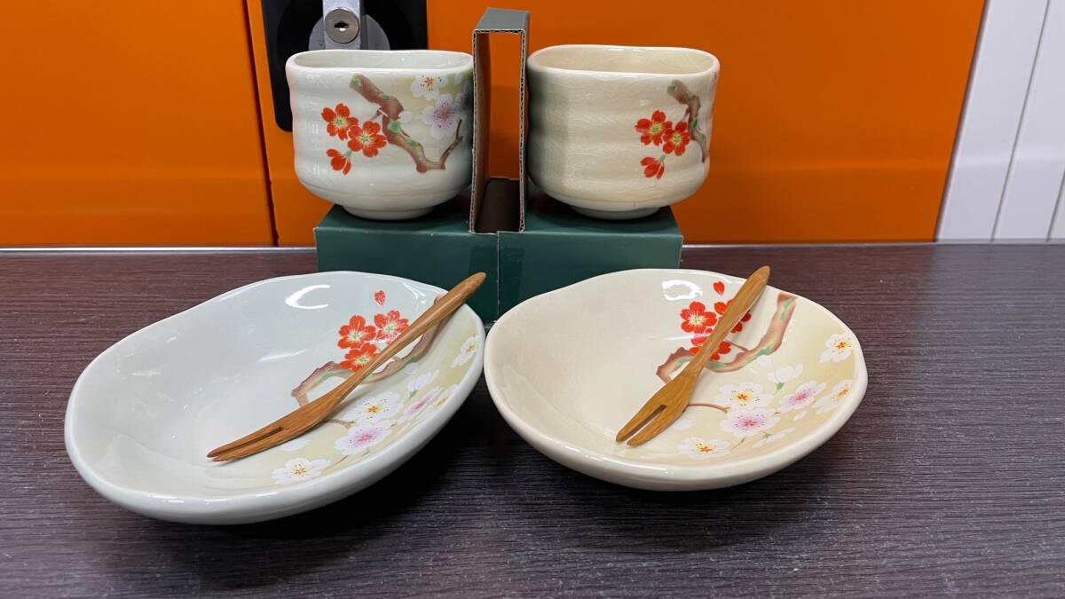 - 1円スタート【未使用品】市田ひろみ 花柄 茶屋セットペア 食器 和食器 プレート 小皿 湯呑み