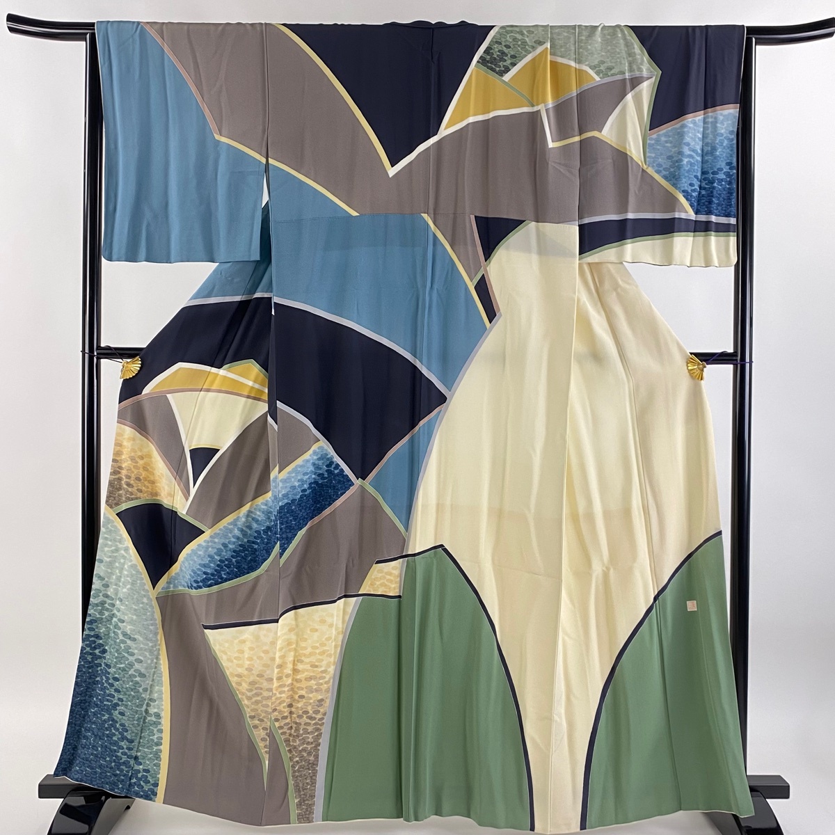 - 訪問着 身丈161.5cm 裄丈66cm M 袷 上野為二 落款 幾何学 青灰色 正絹 逸品 【中古】
