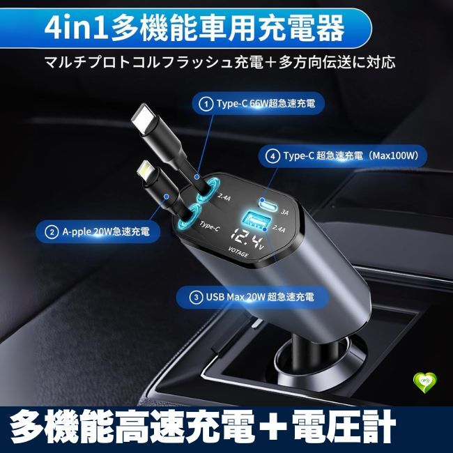 - 【多機能高速充電+電圧計】シガーソケット バイク 車 充電器 4台同時充電 巻き取り式 Type-C100W/20W急速充電 人気 おすすめ
