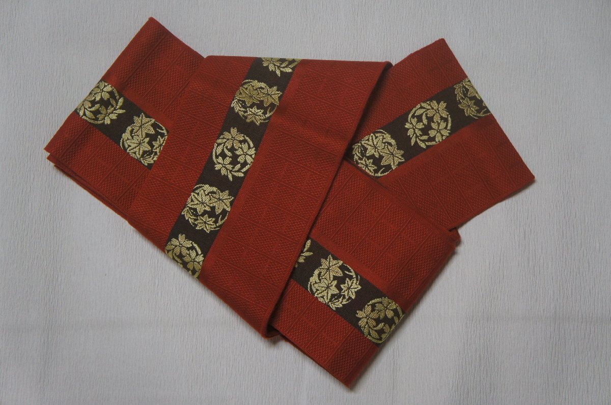 - 半巾帯化繊?交織?猩々茶色地黄黒色縞に花丸模様未仕立て品[N16469]