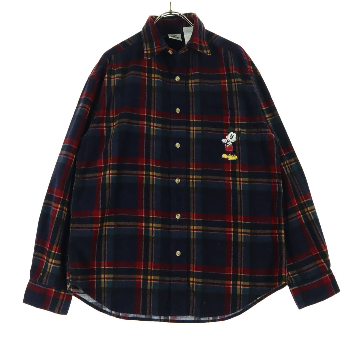 > 美品 The Disney Store ディズニーストア チェック柄 長袖 ネルシャツ S ネイビー ミッキー メンズ