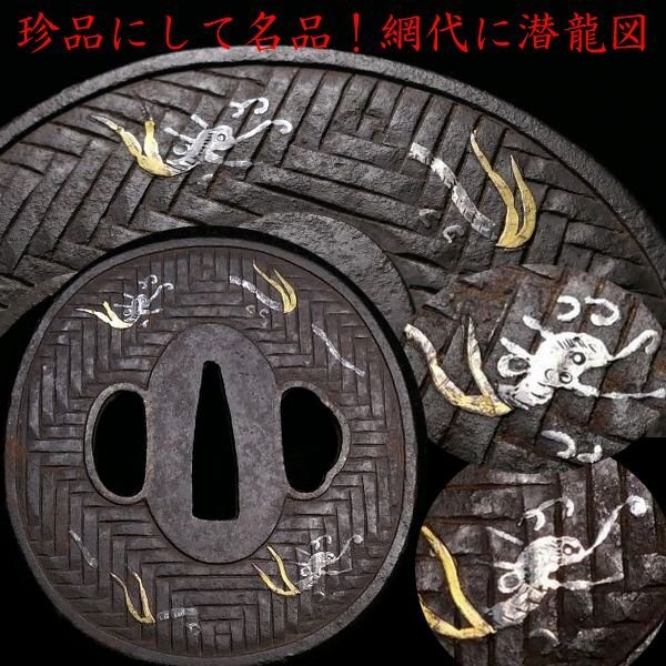 > 【 恵 k0060 】 珍品にして名品! 「網代に潜龍図」 金銀象嵌 鉄地鍔 滅多にない組み合わせの珍しき構図です!検:小柄/刀剣/刀装具