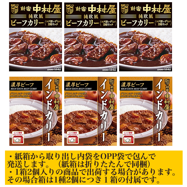 - ■新宿中村屋 純欧風ビーフカリー(黒箱)・インドカリー(濃厚ビーフ) 2種6箱■