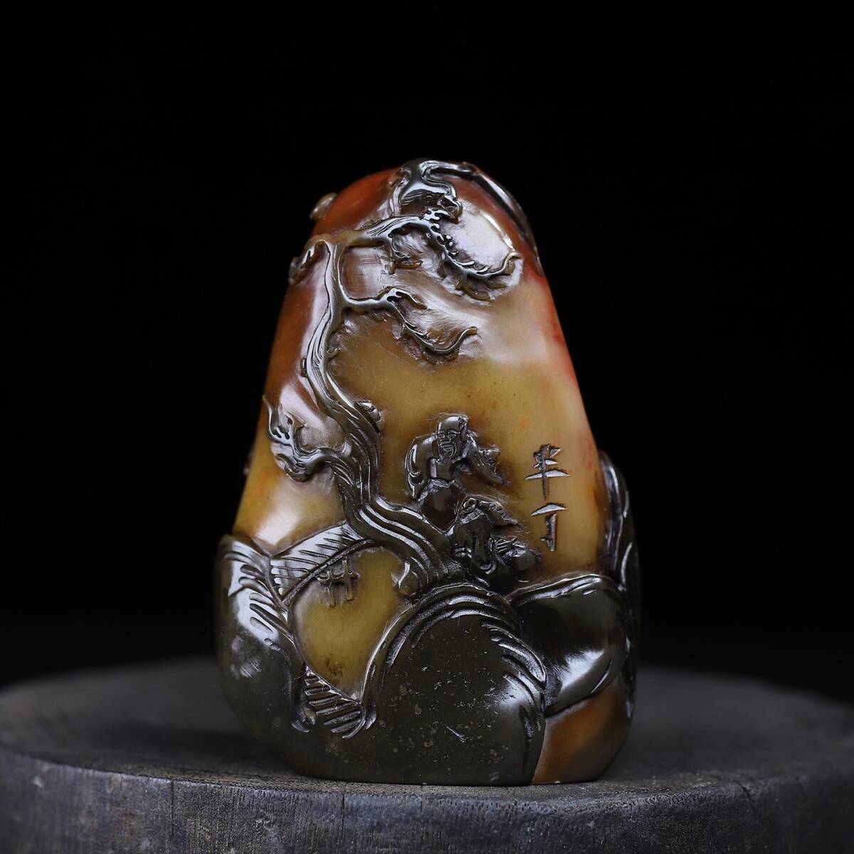 > 【超珍館蔵】寿山石 烏鴉皮 田黄石 細密彫 松下輪道紋印章 印章 印鑒 文房具 書道品 古賞物 古董品 古美術品 時代物 旧家蔵出 稀少珍蔵品