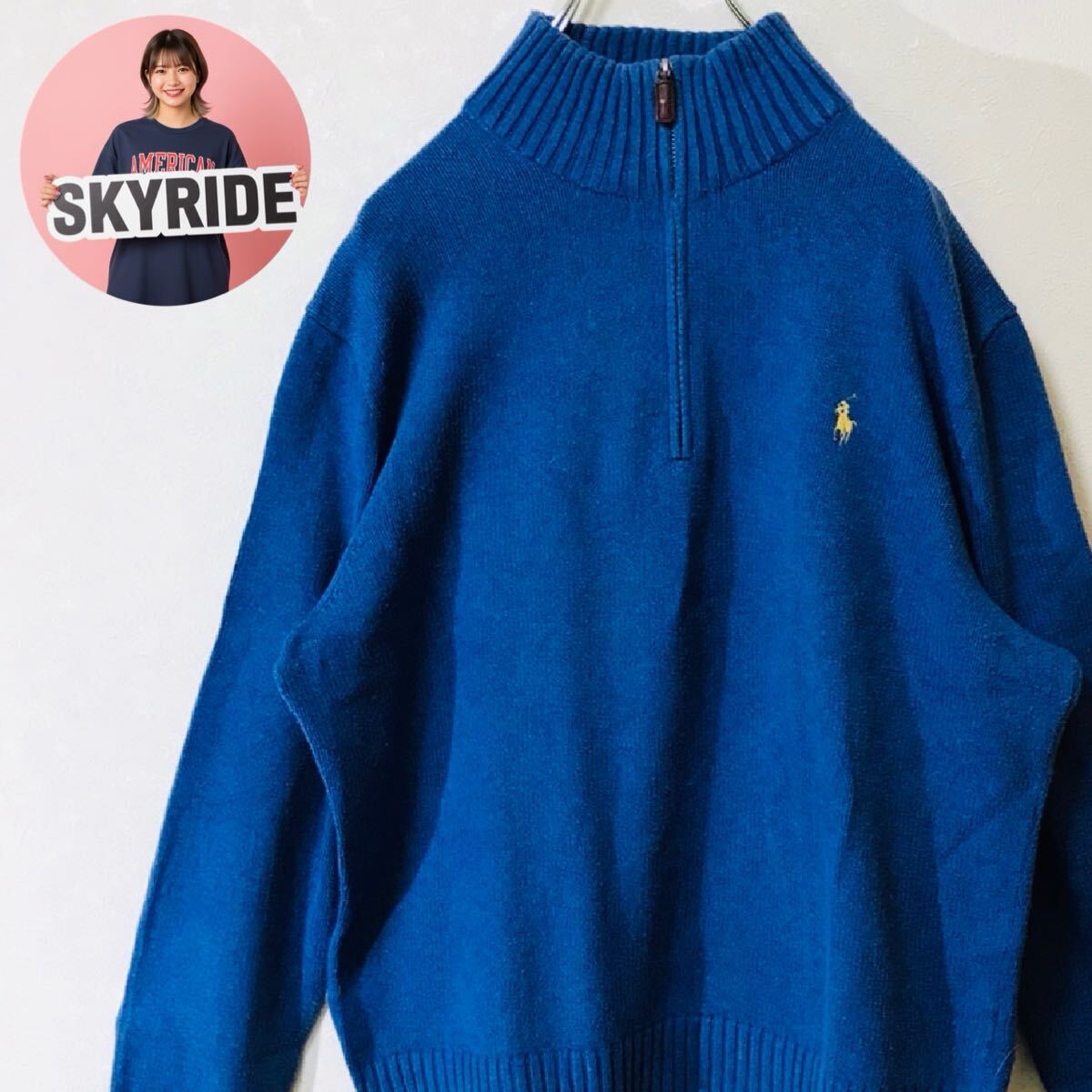 - 【人気】Polo Ralph Lauren ポロラルフローレン 00s メンズ ハーフジップ ニット セーター ブルー M 刺繍ロゴ ワンポイント 古着 #TT0302