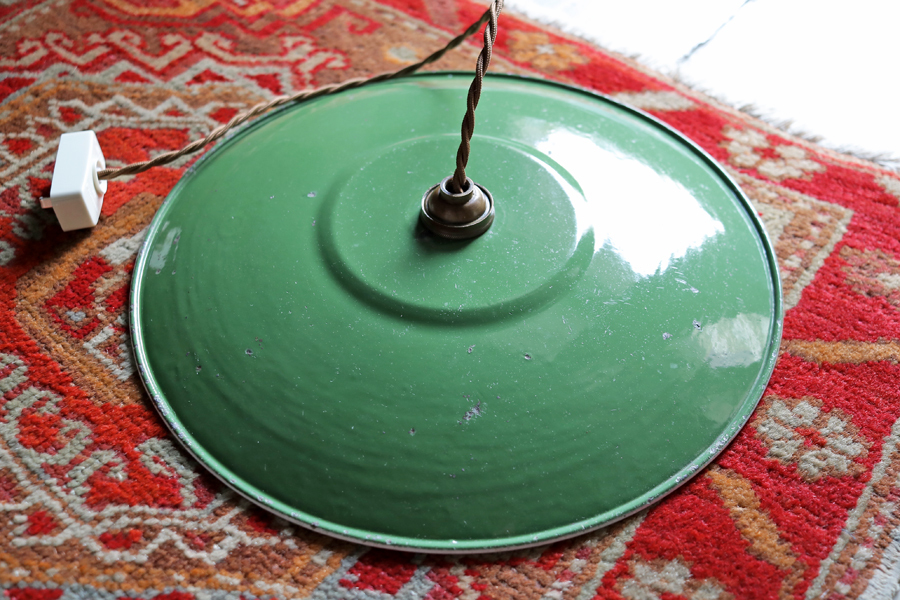 - 白い壁に,,, 29cm 大きな フランスアンティーク 2-A* 緑のホーローランプ 吊り下げ ランプ/北欧 照明 イギリス アトリエ ガレージ ライト