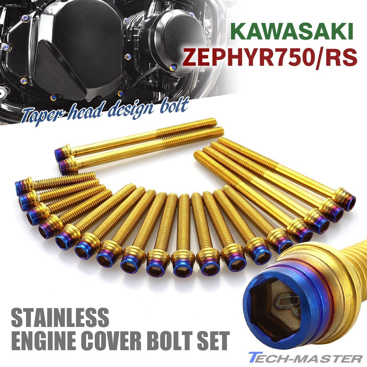 > ゼファー750 RS エンジンカバーボルト 20本セット ステンレス製 テーパーシェルヘッド ゴールド×焼きチタンカラー TB8150