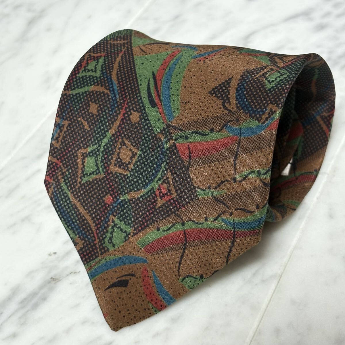 - 【美品】 999円~ Courreges ネクタイ ブラウン系 マルチカラー 総柄 (GREEN B2)