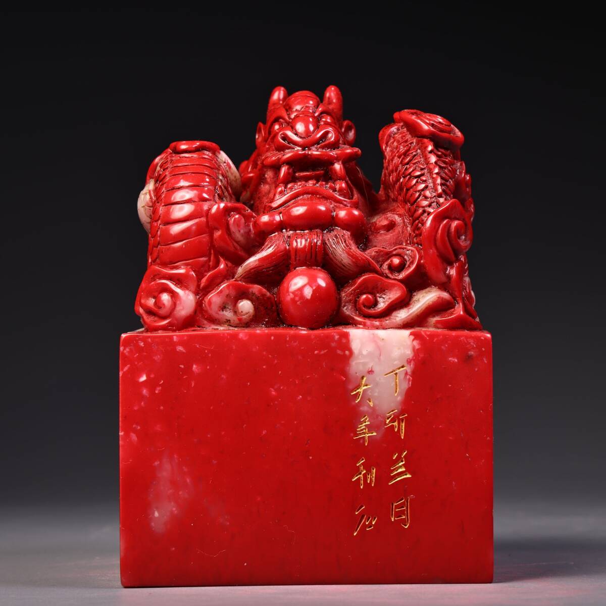 - 蔵友旧蔵出 寿山石 鶏血石 大紅袍 細密彫 神獣戲珠 印章 盒付 文房具 文案置物 書道品 稀少物品 置物 賞物 中国時代美術品