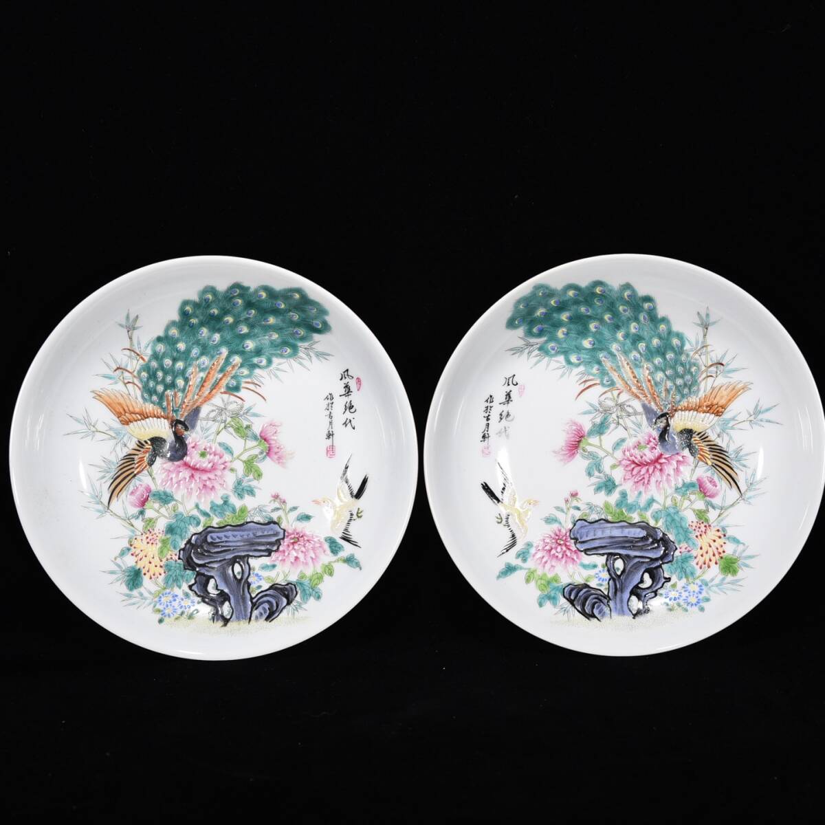 - ◆蔵出◆中国古美術 大清雍正年製款 粉彩 古陶磁 菊花 鳳紋盤 ―對 精品 細密細工造 置物 擺件 古賞物 骨董 時代物 A06