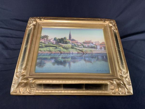 > 0u1k59-023 【真作】中根寛 作 「水辺の邑 (ボルドー郊外)」油彩 6号 額装 サイン有り 箱入り 風景/油絵