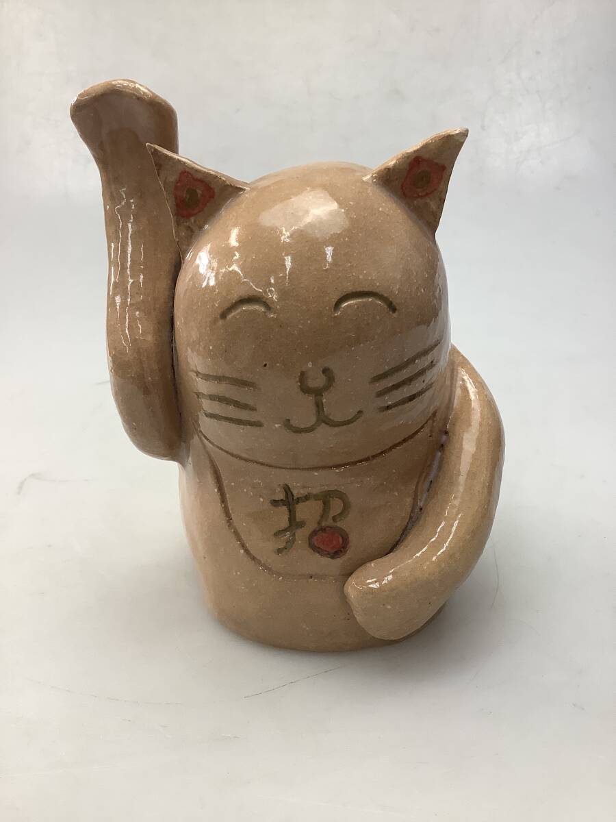 - T0180 陶器 招き猫 縁起物 置物 銘有 在銘 作者不詳 ブサカワ 中古