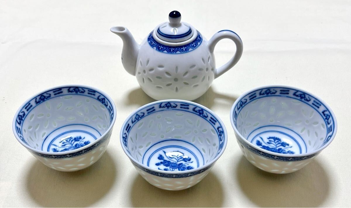 - 中国茶器 染付青花 蛍透 急須&湯呑3客