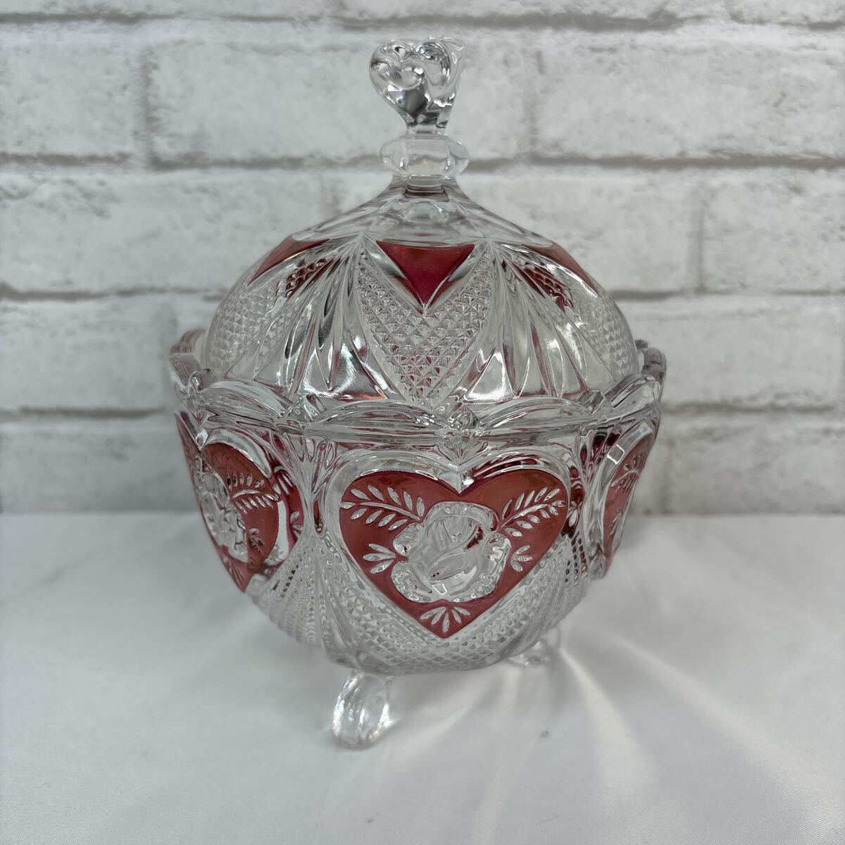 > 希少 ホフバウアー風 クリスタル キャンディポット 蓋付き ハート&ローズ 赤カット アンティーク調 小物入れ
