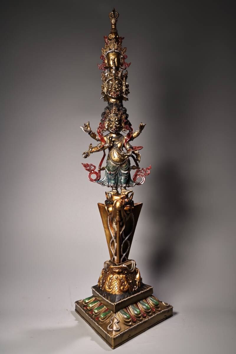 - zz9|8662 中国骨董品 人間国宝 銅制 極細工【西蔵工芸純銅全銅高浮彫鏨刻彩色蒔絵六臂マハガラ金剛降魔杵法器】時代物 珍品旧蔵 伝世家珍