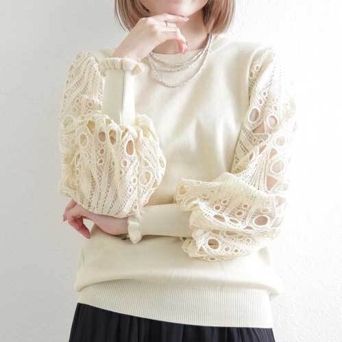- お袖レース ニットブラウス M~L|長袖 フェミニン 体型カバー きれいめ カットソー トップス 192458