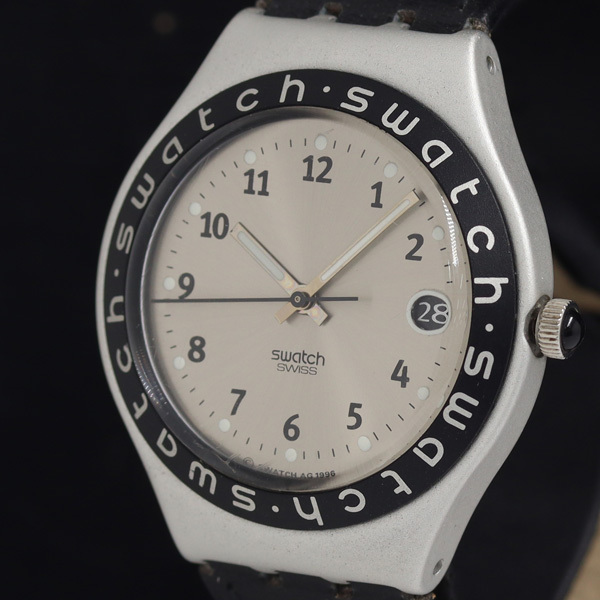 - 稼働 スウォッチ アイロニー アルミニウム QZ シルバー文字盤 デイト メンズ腕時計 KRH 2000000 NSK
