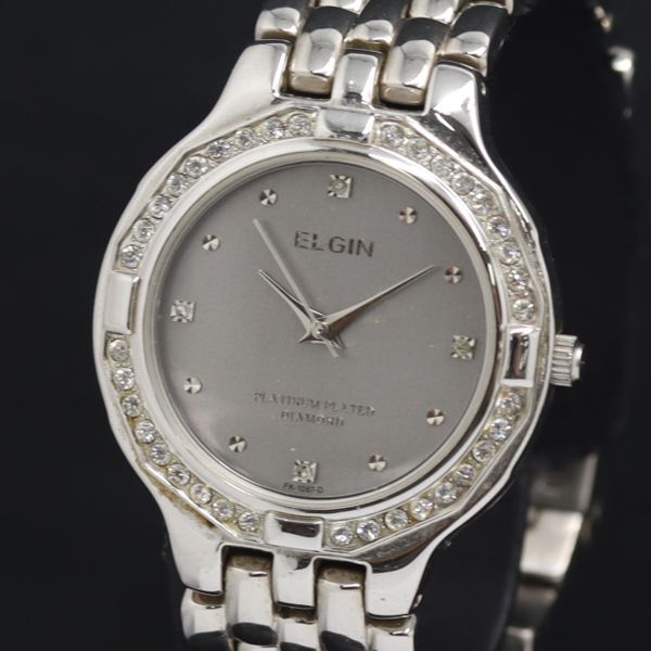 - 稼動 QZ 良品 箱付き エルジン 石付 FK-1087-D グレー文字盤 レディース腕時計 KRK 2000000 NSK