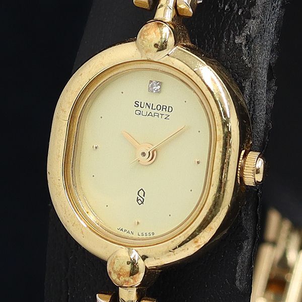 - 稼動 良品 QZ サンロード L5559 オーバル 石付 ゴールド文字盤 レディース腕時計 OKZ