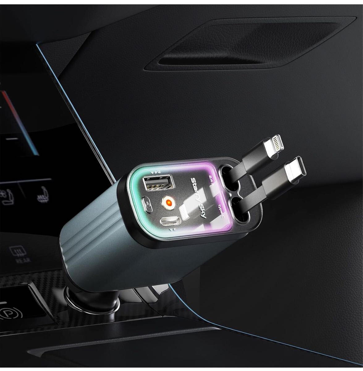 - シガーソケット 車載充電器 USB & USB-C Type-C 器 巻き取り式 ケーブル ムードライト ホームスター 車載充電器 66W 12V 24V ブラック