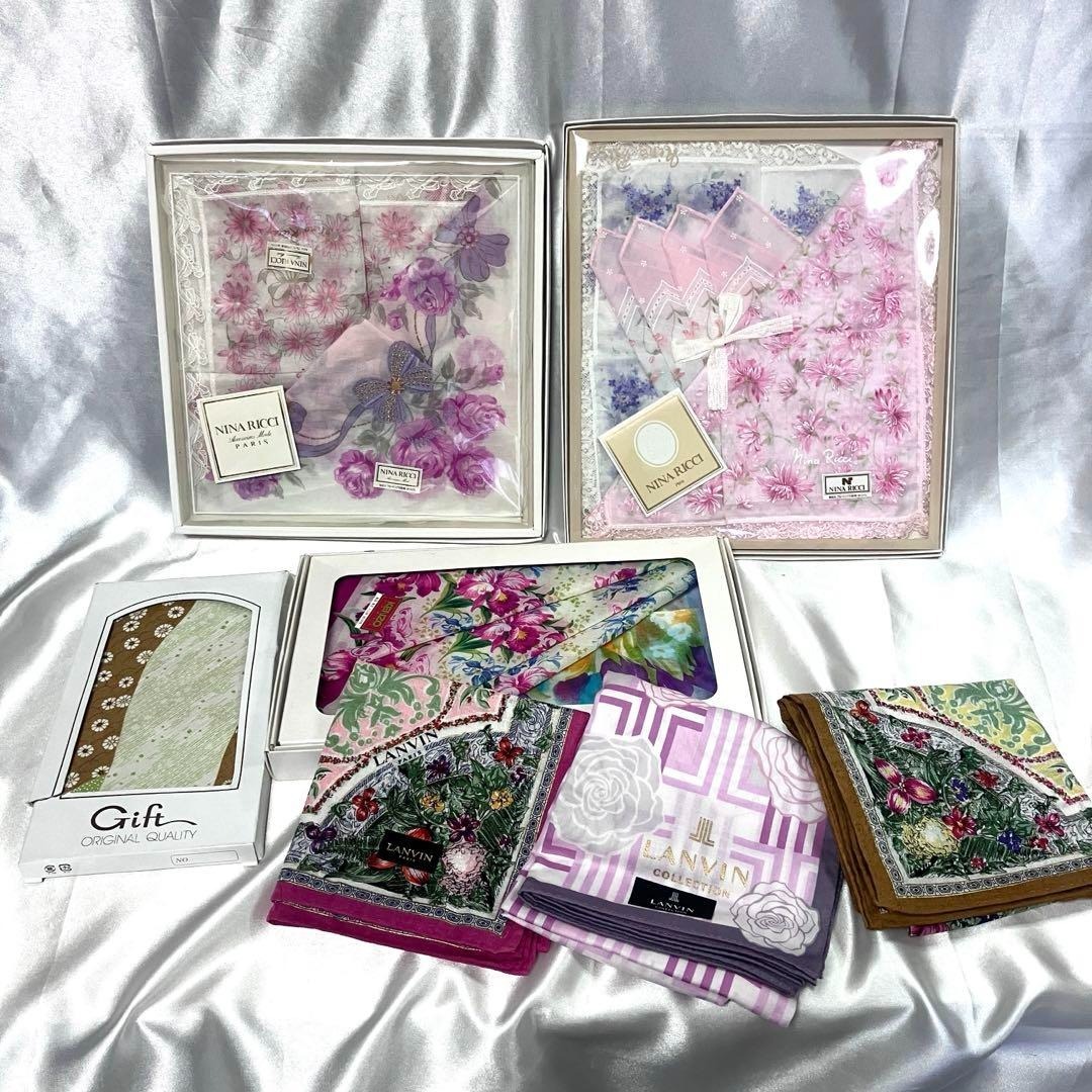 - NINARICCI LANVIN ブランド レディーススカーフ 7点セット 綿100% ポケットチーフ ブランドセット 肌に優しい天然素材 フラワーモチーフ