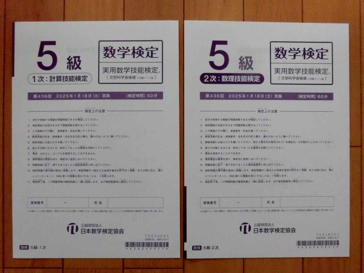 - 送料180円 数学検定 5級 第436回 2025年 過去問 本物 実物 1次 2次 実用数学技能検定 解答用紙付き 中1 受験 資格 計算技能 数理技能