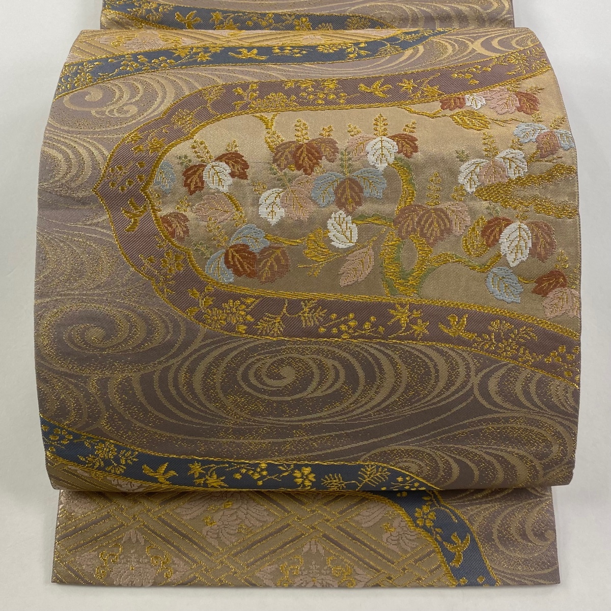 > 袋帯 逸品 北出与三郎 本袋 桐 向かい鳥 金糸 刺繍 灰紫 六通 正絹 【中古】