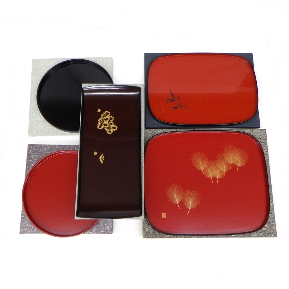 > A25-1832【5点セット】輪島塗 盆 清甫/萬砂堂 萬砂文蔵/池盛政喜 角盆 長角盆 丸盆 箱つき 漆器 蒔絵 沈金 伝統工芸品 保管品 トレー