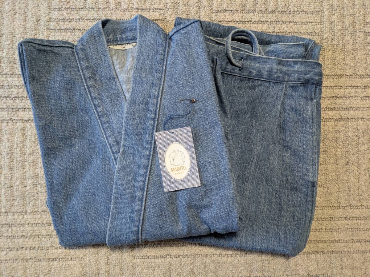 - 岡山 井原 日本製 藍の里 デニム 作務衣 上下セット Mサイズ 綿100% 最高級 和装 和服 甚平 法衣 袈裟 仏教 装束 仏具 威儀 職人 512B