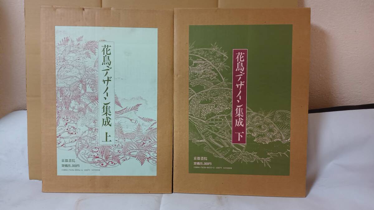 > 花鳥デザイン集成上下 ケース付 上巻裏表紙のビニルカバー一部欠有 京都書院 計5万円 上巻1989年1月25日・下巻19892年2月22日発行 大1-2