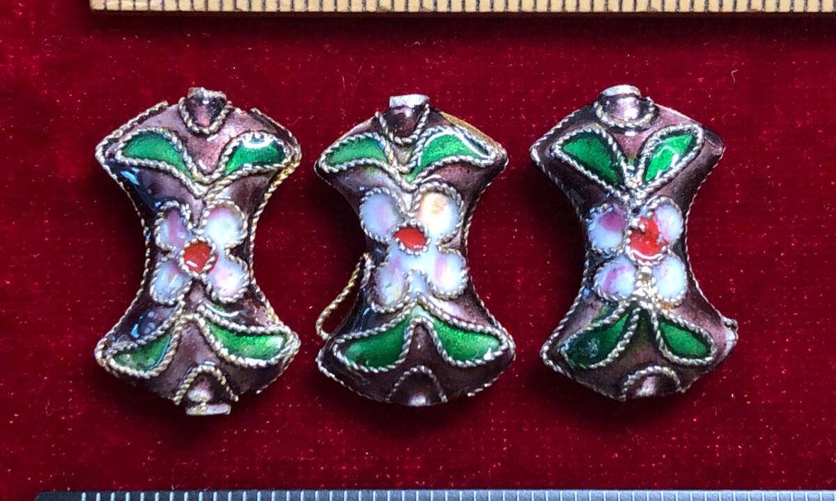 - ¶!¶ 有線七宝焼ワールド - 3個の双扇型ペンダント ¶!¶ 約厚6㎜×14㎜×21㎜ 金線褐色釉緑葉 手作り 手芸 工芸 インテリア ペンダント