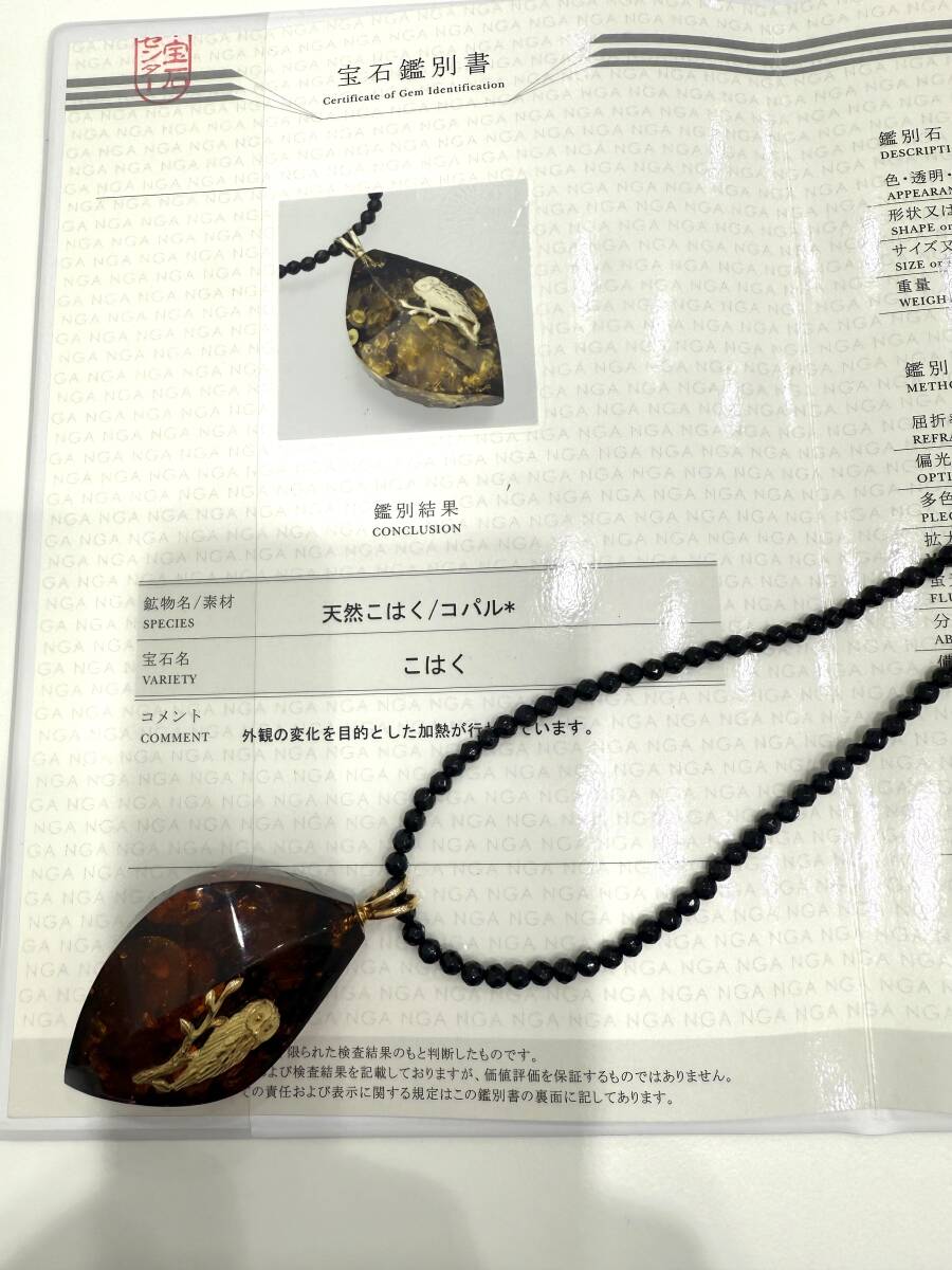 - ●N7-9-34 天然琥珀 ネックレス 鑑別書付き こはく/コパル オニキス フクロウ 金具類 k18 中古品 美品