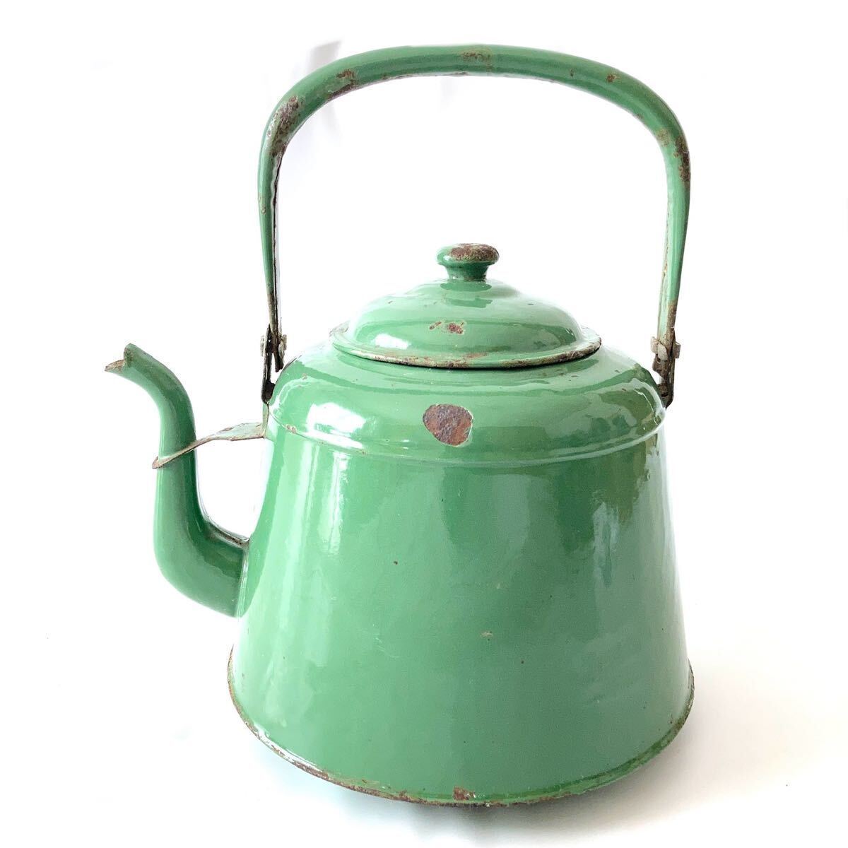 - アンティーク雑貨☆昭和レトロ当時物☆グリーンのホーローケトルやかん焼缶インテリア琺瑯 ヤカン 湯沸 ケトル やかん