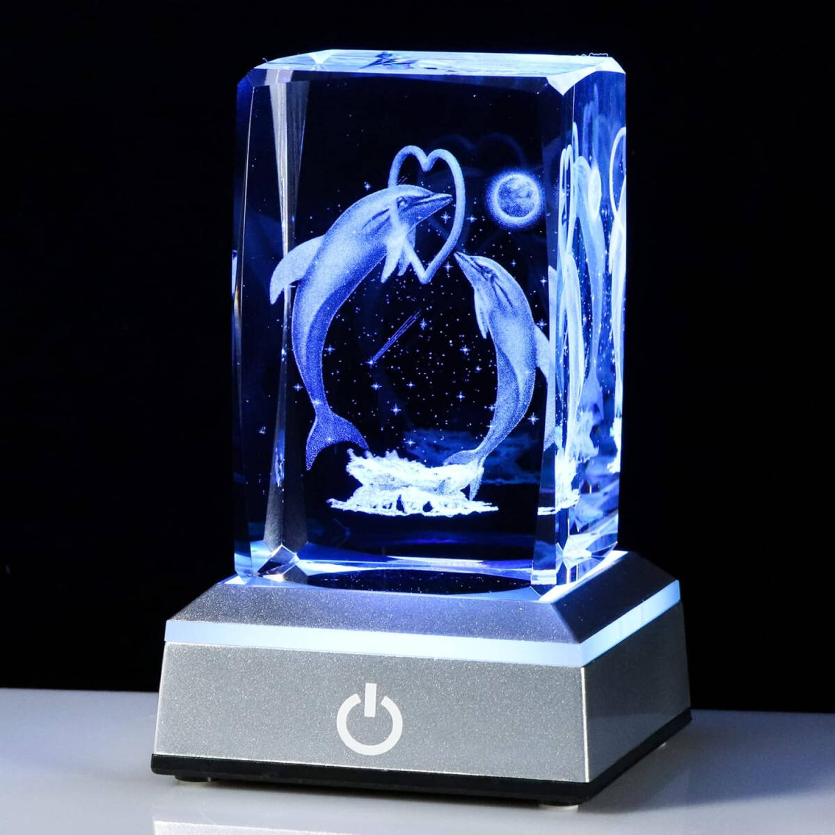 - 3Dクリスタル イルカ2 LEDライトベース USB充電 レーザー彫り アート 置物 オブジェ 照明 クリア ガラス 透明 プレゼント