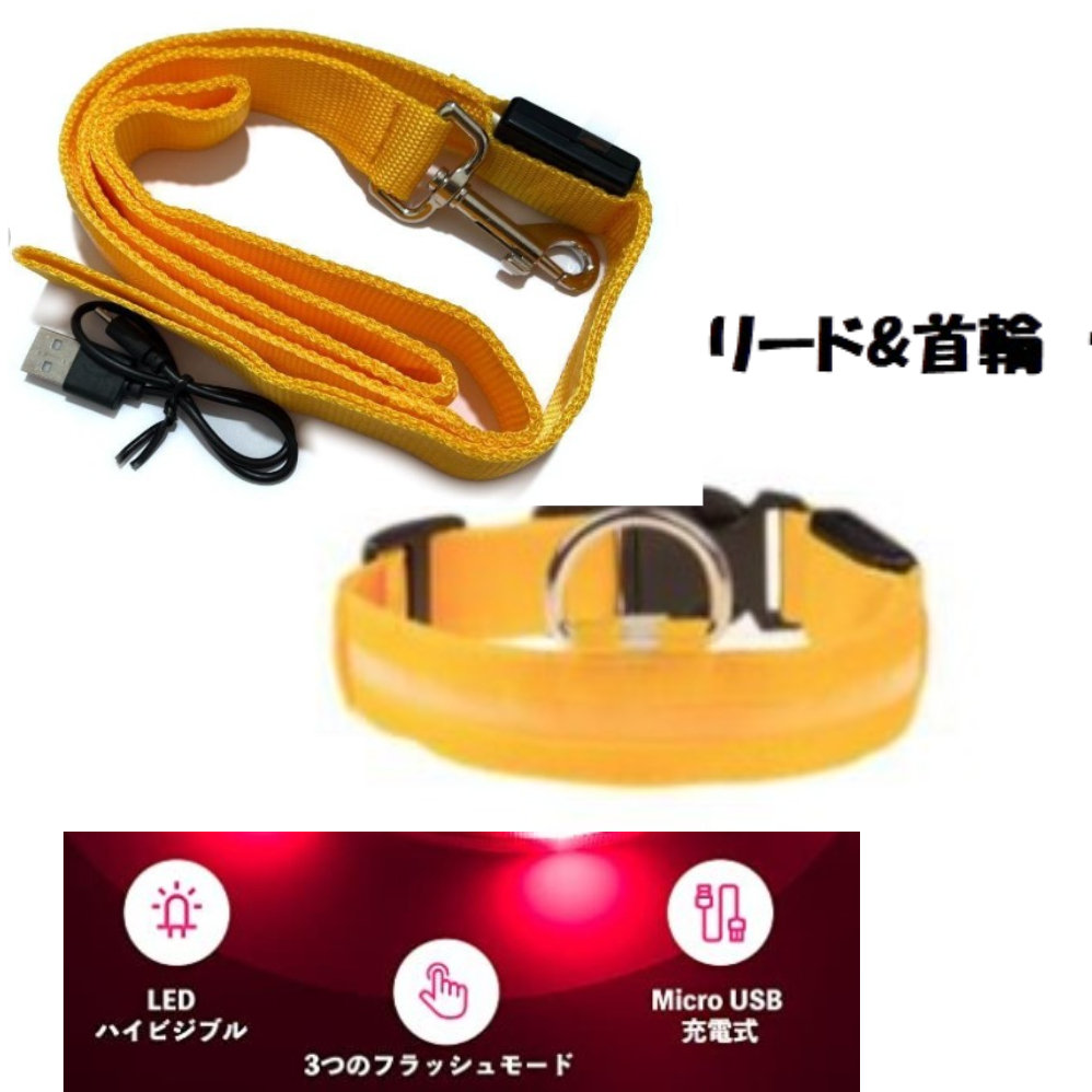 - 新品●送料無料●光る リード&首輪 サイズL イエロー 2点セット 夜道も安心