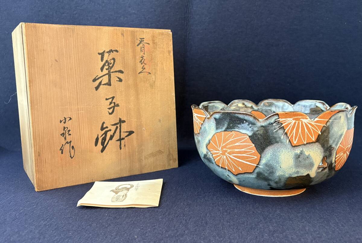 - 未使用 美濃焼 京焼 天目花文 菓子鉢 「小泉作」 共箱付き 陶雅堂 菓子器 ボウル 陶磁器 焼物 日本美術 アンティーク