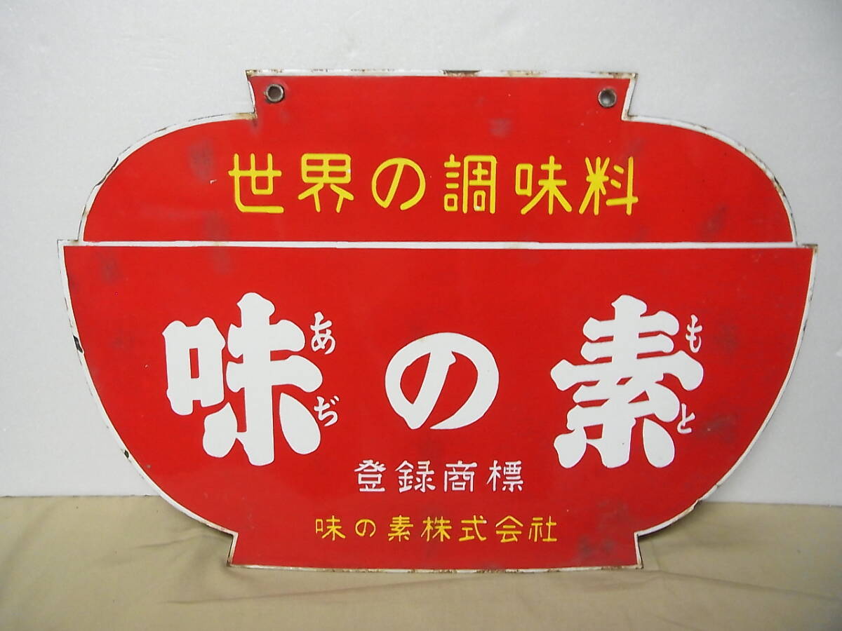- 未使用(保管傷あり)☆ 昭和レトロ 当時物 味の素 お椀型 調味料 両面看板 店頭用 琺瑯看板 ホーロー看板