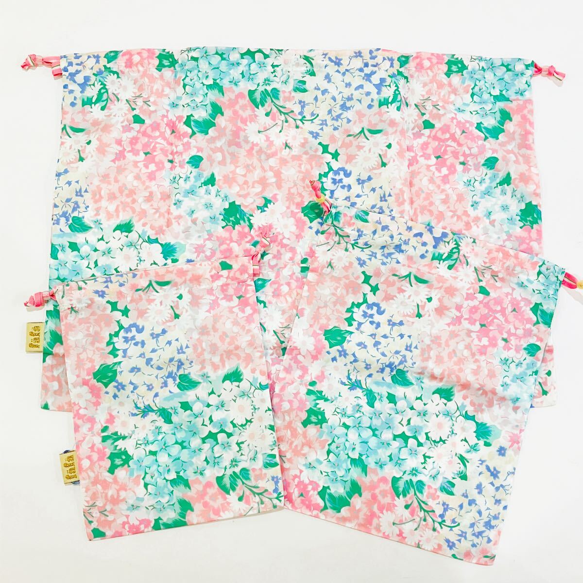 > 【新品未使用】fafa フェフェ 巾着袋 3枚セットグリーンマルチフラワー 花柄 ピンク 撥水加工 ポリエステル 旅行 小物収納 体操服 かわいい
