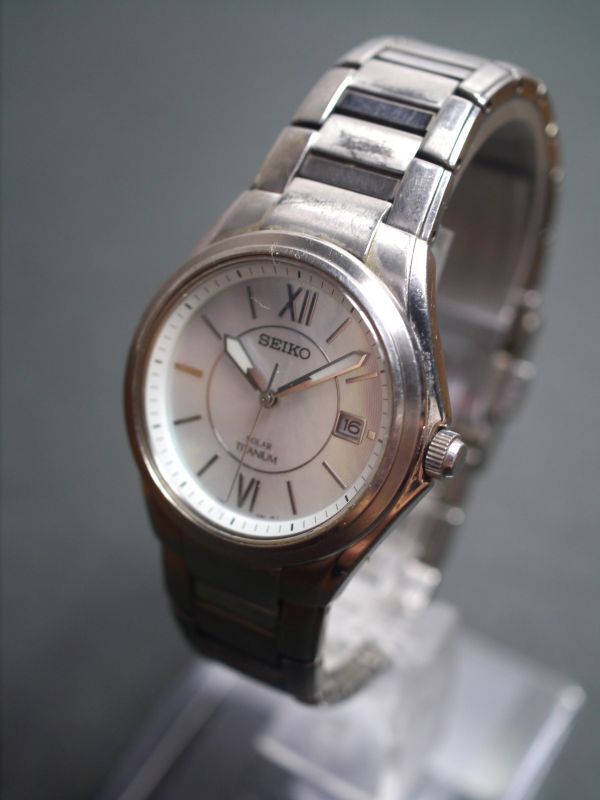 - セイコー SEIKO ソーラー 3針 デイト シェル文字盤 チタン 純正ベルト V145-0BA0 男性用 メンズ 腕時計 ab773 稼働品