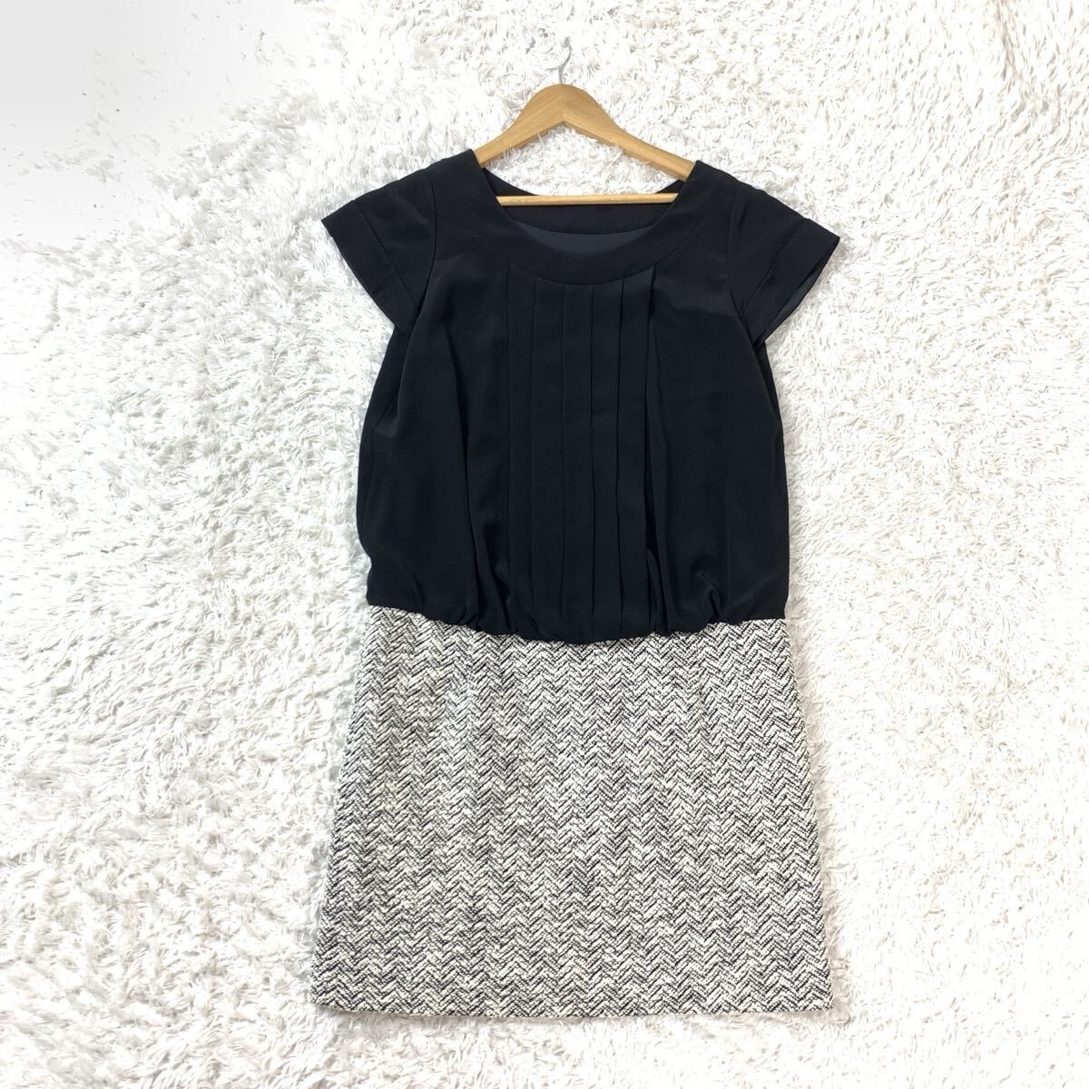 > INED イネド 膝丈ワンピース 半袖 フレンチスリーブ 綿 コットン タイト ツイード 裏地あり 黒 ブラック 9 YA154
