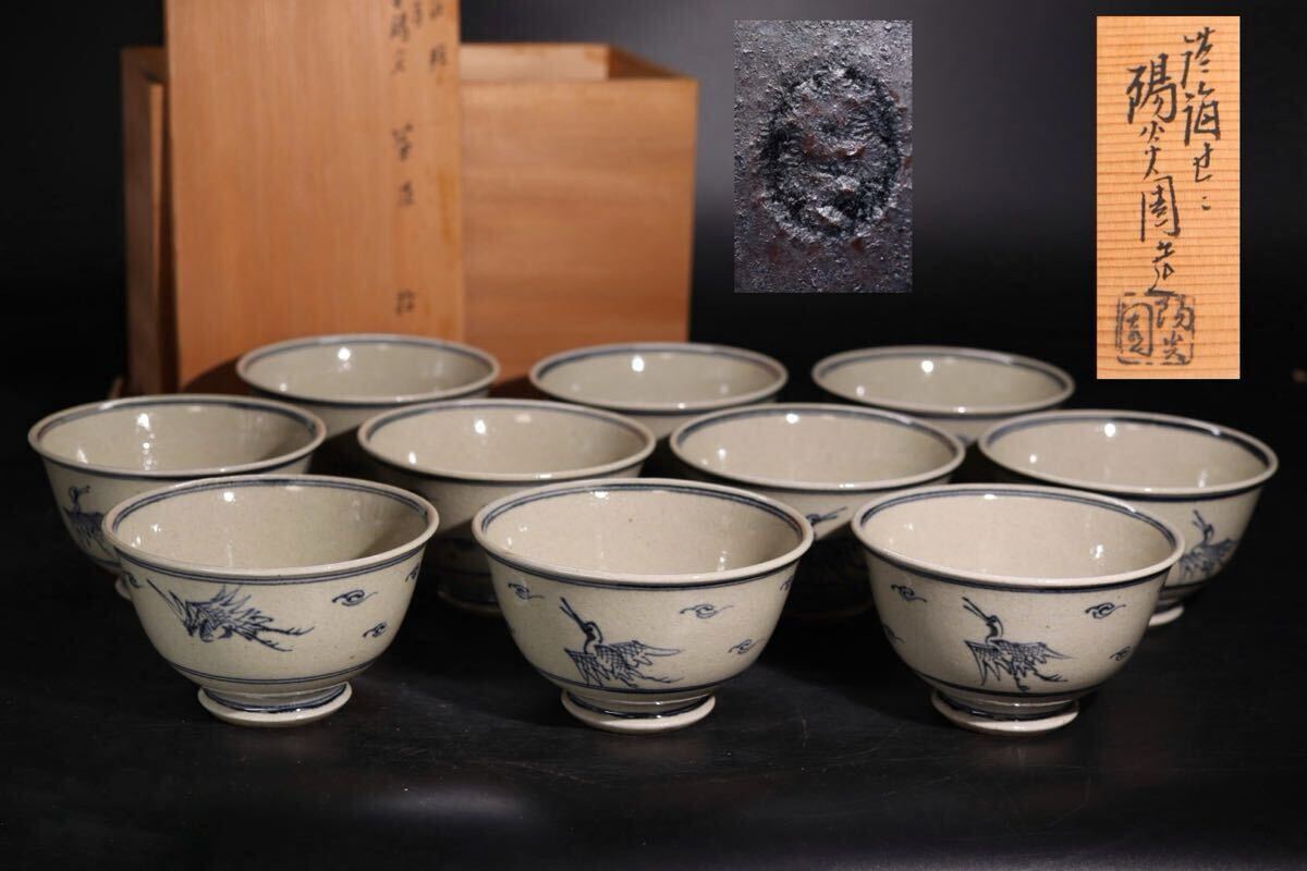 > 淡海ぜぜ 陽炎園 造 「 膳所焼 安南 写 雲鶴文 茶碗 十客 」 共箱付 / 茶器 煎茶道具 .G2582