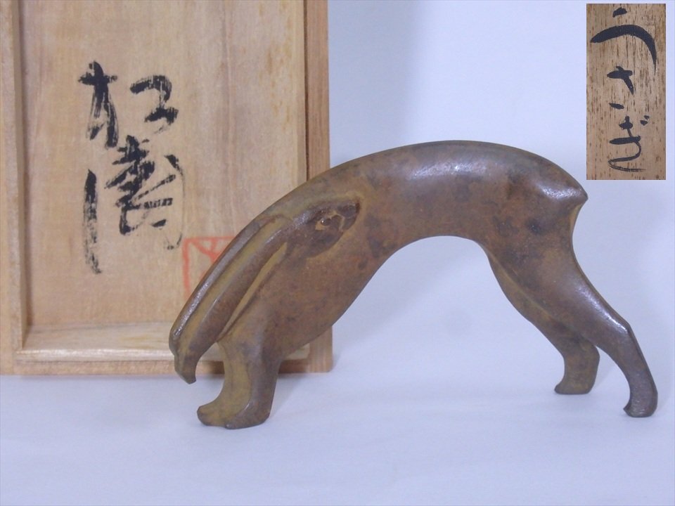 > ★人間国宝 二代須賀松園【うさぎ 共箱】江戸風蝋型鋳物 約150g 寸法11.3×3×高さ6.4cm 高岡銅器 文鎮 兎 干支卯