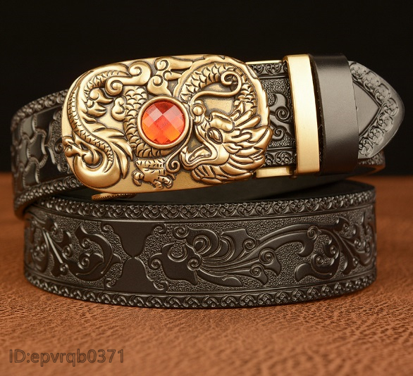 > レザーベルト※新品 オートロック式 バックル ドラゴン龍 本革 宝石飾り メンズベルト 幅3.5センチ 紳士 長さ調整可能 /黒