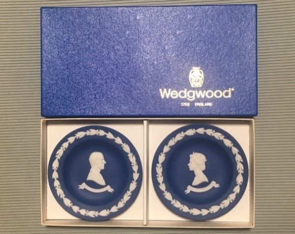 - ◎ウェッジウッド ロイヤルブルージャスパー 英女王即位25年記念 綺麗な小型プレート 2枚セット◎8r箱付