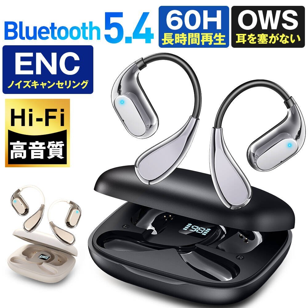 > ワイヤレスイヤホン Bluetooth5.4 骨伝導イヤホン 空気伝導イヤホン 耳掛け式 高音質 両耳 片耳 軽量 ブルートゥース 防水 ホワイト