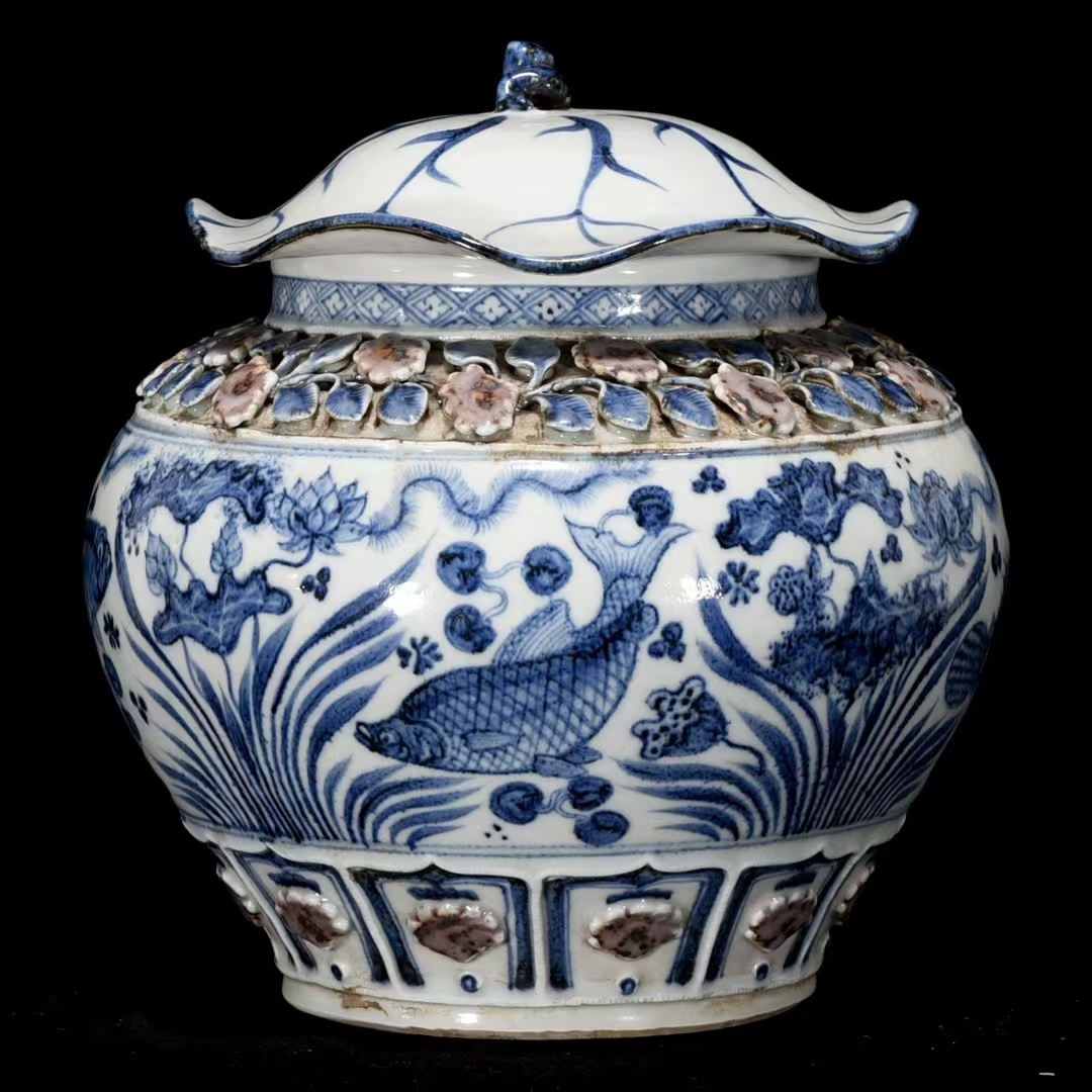 - 秘蔵 元青花釉里赤摘み花魚藻紋ハス葉蓋缶 古陶磁器 陶芸 唐物 珍品旧蔵 古賞物 時代物 骨董品 古置物 極細工 中国磁器 古美味 中国古玩921