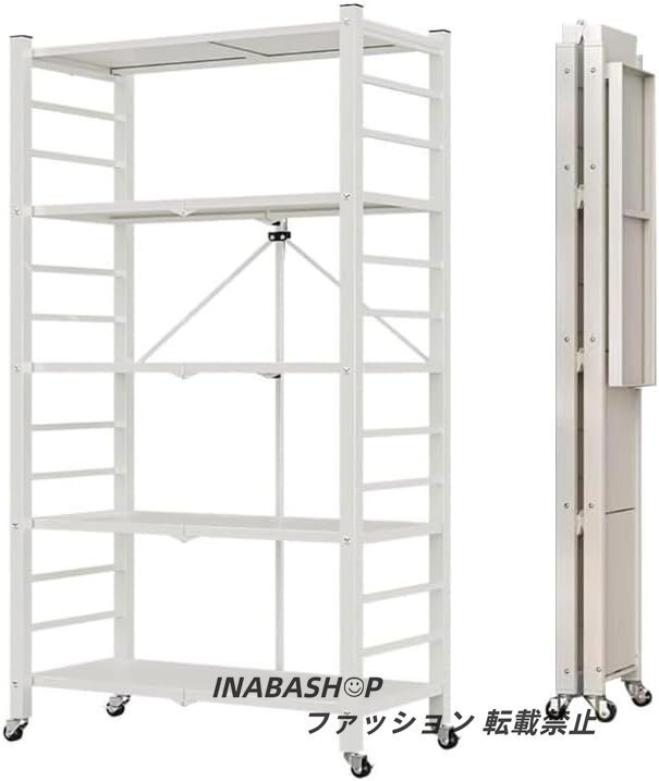 - 折り畳み式ラック 5段ブラック 折り畳み式収納 収納ラック 収納棚 オープンラック キッチンラック 360°回転キャスター付き