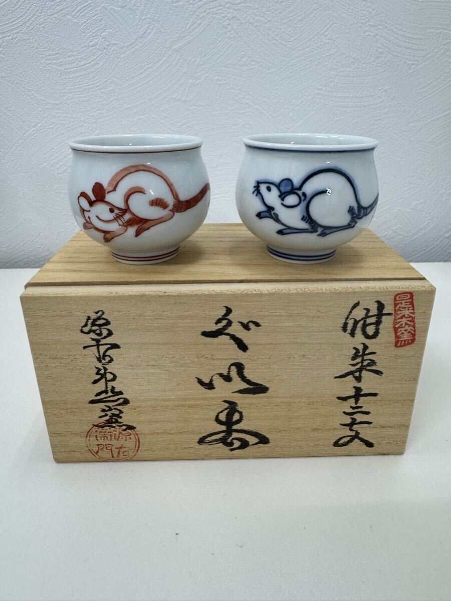 - ネズミ絵柄の陶器お猪口(赤青) ぐい呑み 源右衛門窯造