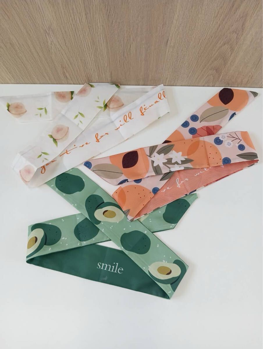 - 【中古品】果物フルーツ 花フラワーモチーフ ナロースカーフ3点セット リボンスカーフ ストール シルク調 ファッション小物スカーフ リボン