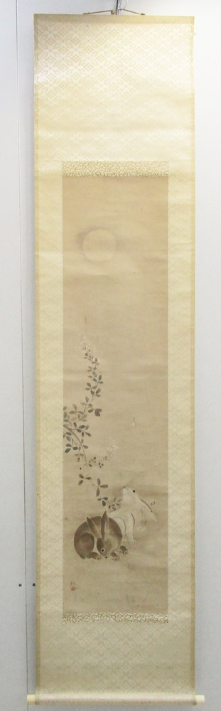 - 《ジャムルK》 KKA0918-99◆掛軸 秋草双卯 作者不明 兎 月 掛け軸 床飾 日本画 全長:約179cm 幅:約41.5cm 穴あり